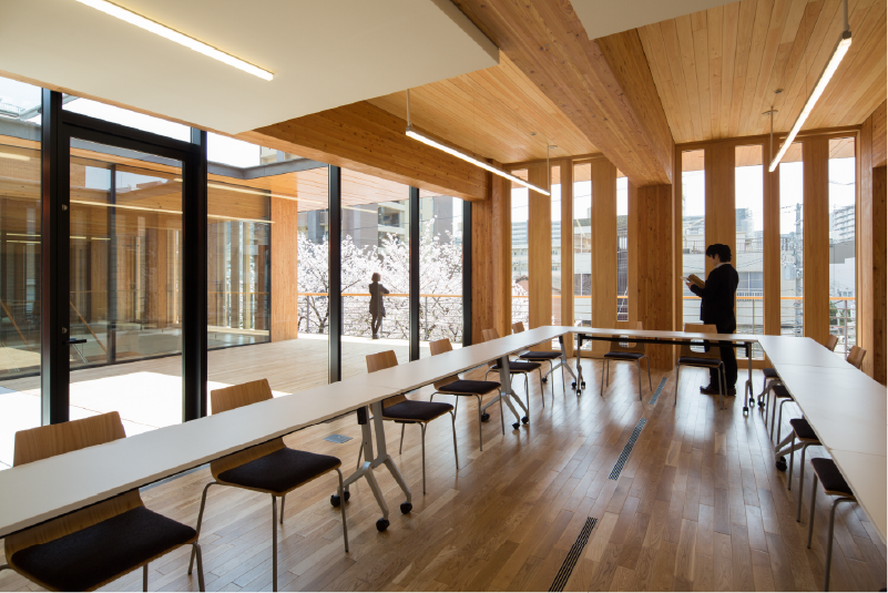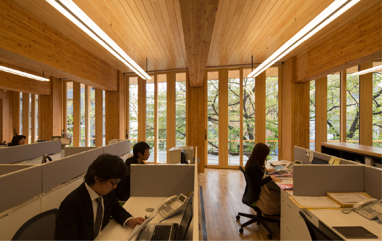 木の香り漂う、日本初の耐火木造オフィスビルで仕事ができます。数々の賞を受賞した有名な建物です。アクセスも便利です。